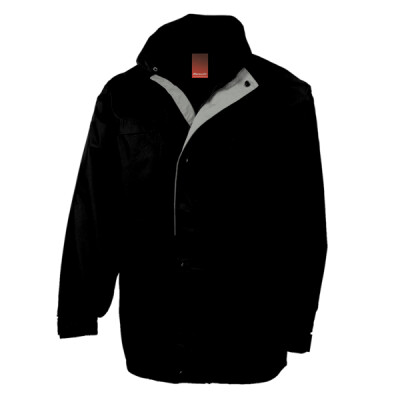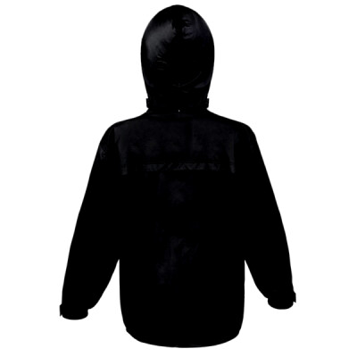 StormDri 4000 polyester outer with PVC coating. Polyester mesh upper body lining and nylon taffeta lower body and sleeves. Waterproof 4000mm with taped seams. Windproof. Concealed adjustable hood. Full length zip with studded storm flap. Inner zip guard. Back vent. Two front pockets. Media pocket. Left chest zip pocket. Part elasticated, tear release adjustable cuffs. Adjustable drawcord at lower hem. Cut out label. Access for decoration.