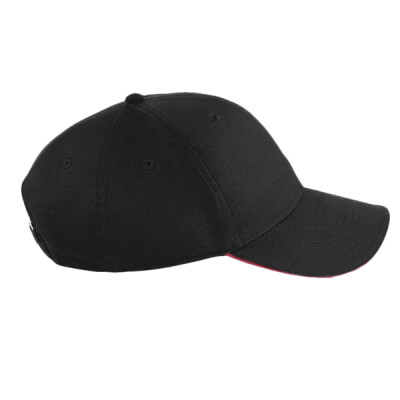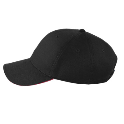 100% brushed cotton. 6 panel. Mid profile. Stitched ventilation eyelets. Structured front panels. Pre-curved peak. Contrast sandwich peak. Self fabric strap with tri-glide buckle. Tear out label.