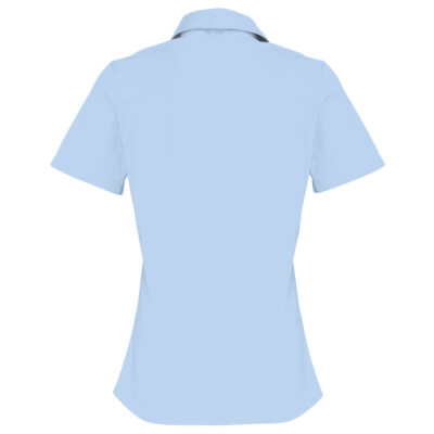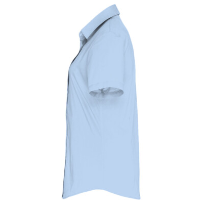 97% cotton/3% elastane. Soft feel stretch fabric. Fitted style. Stiffened cut away collar. Single button closure on collar stand. Grown on placket. Back yoke. Back darts. Curved hem. Available in long sleeve PR344.