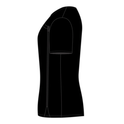 100% polyester plain weave. Easy care fabric. Cross over neckline. Asymmetric zip front. Vented cuffs. Princess seams with topstitch. Side vents. Machine washable.