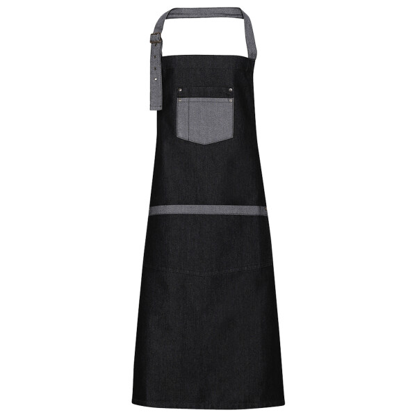 70% cotton/30% polyester. Easy care fabric. Contrast neckband with adjustable metal buckle. Contrast fabric ties with metal eyelets. Reverse contrast denim centre chest pocket and pen pocket. Lower front pocket and pen pocket. Width 72cm. Length 86cm. Industrial laundry 85°C. Domestic wash 60°C.