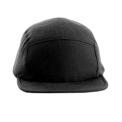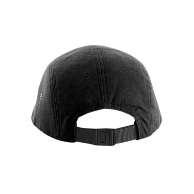 100% cotton canvas. 5 panel. Metal ventilation eyelets. Flat peak. Snap fastening strap adjuster. Tear out label.