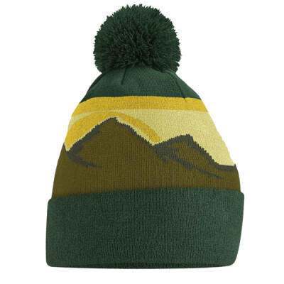 95% recycled polyester/4% nylon/1% elastane. Double layer knit. Cuffed design. Self colour pom pom. Bold mountain scape design. Tear out label.